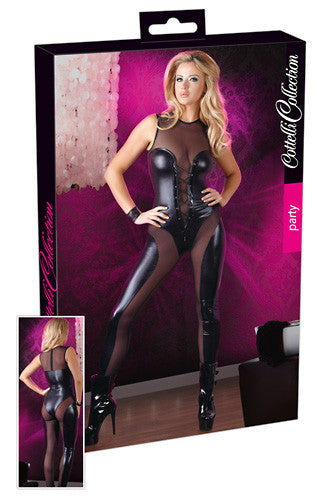 Jumpsuit with lace at the front made out of transparent powernet, combined with shiny wetlook. Sleeveless. 2-way zip at the crotch. Can be put on and taken off easily because of the long, hidden zip at the back. 60% polyester, 30% polyamide, 10% elastane.