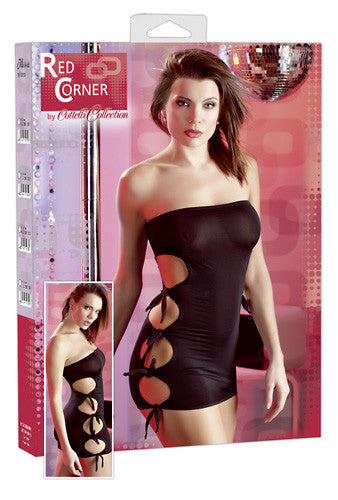 Black, slightly transparent strapless tube dress with cut-outs at the side and knots that can be untied. 95% polyester, 5% elastane.