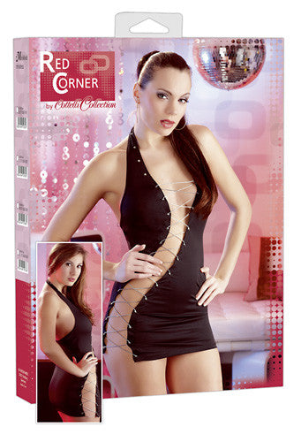 Black, slightly transparent mini dress with silver-coloured decorative lacing running diagonally from the cleavage to the right thigh.