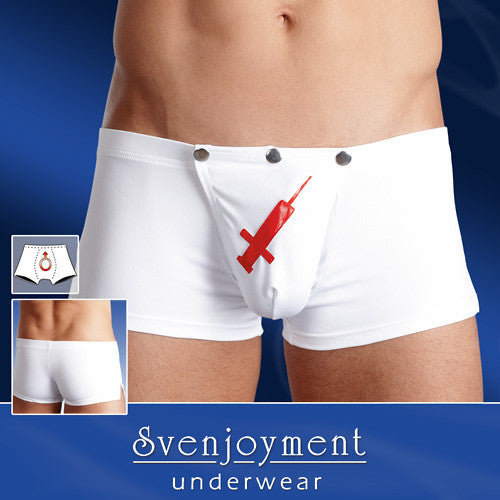 White pants with sewn-on red syringe. Pouch with press studs and swell-function. Material: 90% polyester, 10% elastane.
