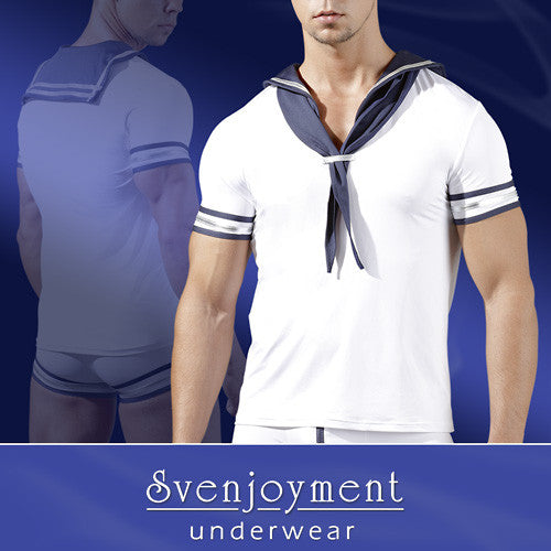 Straight cut shirt in sailors-style with large V-neck and detachable scarf. Short sleeves with three stripes. White/silver/blue. 86% polyester, 14% elastane.