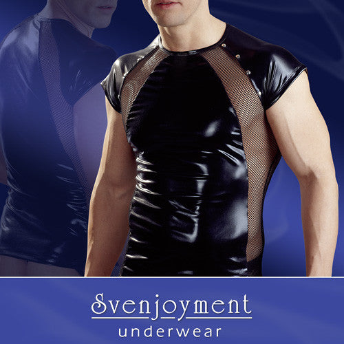 Black shirt made of net fabric and wetlook. The sleeves are adorned with decorative rivets. Black. 92% polyester, 8% elastane.