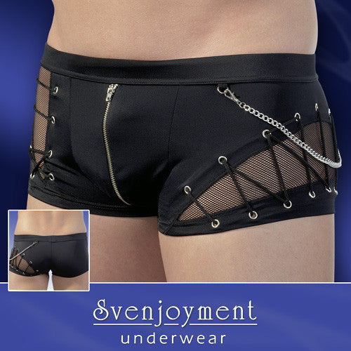 Boxer briefs with a great material mixture of opaque and transparent (fishnet),a detachable decorative chain and a zipper in the front. Black. Extremely elastic. 80% polyamide, 20% elastane.
