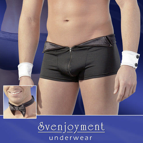 Boxer briefs with zipper in the front (70% polyester, 20% polyamide, 10% elastane), bow and cuffs (90% polyamide, 10% elastane). Black/white.