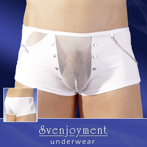 with 'hard' macho details like studs, a safety pin on the side and a removable chain. Front and sides have mesh inserts. White. Easy and comfortable-fit. 90% polyester, 10% elastane.