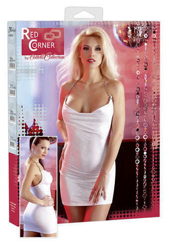 White mini dress with a silvery shine, cowl neck and a silver-coloured chain serving as halter neck strap. 92% polyester, 8% elastane.