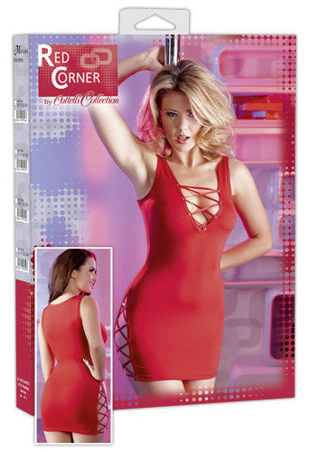 Tight-fitting mini dress in a thrilling red colour with revealing lacing across the cleavage and on both sides, down both legs. 95% polyester, 5% elastane.