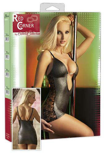 This black mini dress, emphasising beautiful female curves...The flowal lace inserts on the sides and the rhinestone adornment between the breasts bring a romantic touch into play. Slightly transparent with a soft shimmer. Adjustable straps. 82% polyester, 10% polyamide, 8% elastane.