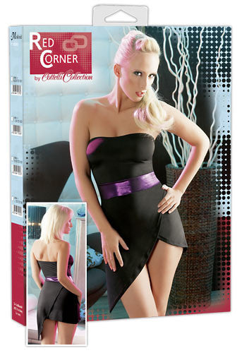 Tight-fitting strapless mini dress in wrap look. With a gloosy belt in purple metallic finish. 95% polyester, 5% elastane.