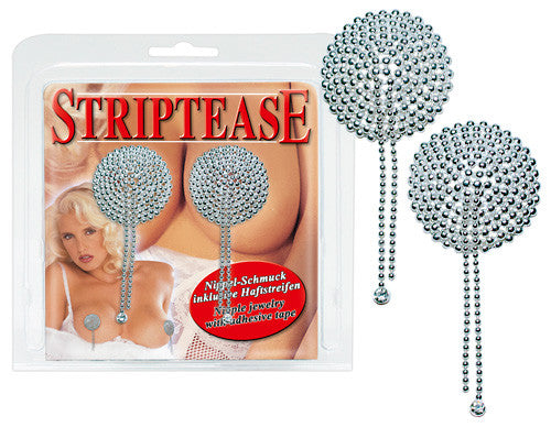 This exciting and glittery nipple decoration turns every women into a professional stripper: because when the bra comes off in the strip show, this jewellery is the icing on the cake. The nipple decoration is made of numerous silver coloured pearls and each sticker has two chains attached, with one chain on each that has a decorative rhinestone on the end. They stay securely in place, thanks to the self-adhesive strip at the back. Ø approx. 4 cm. 1 pair.