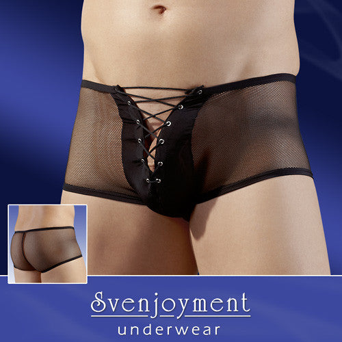 These pants feature a combination of black-toned light microfibre and hot fishnet meshes. Has a v-shape front lacing. Very elastic and body-hugging fabrics. 85% polyamide, 15% elastane.