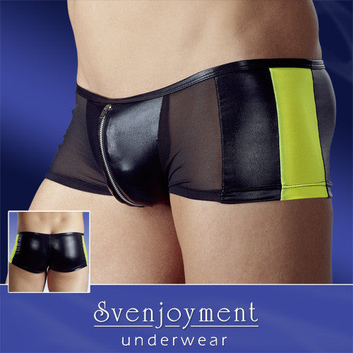 Black pants made of powernet fabric and wetlook material. With padded zipper inside the pouch and yellow-coloured lateral powernet stripes. 92% polyester, 8% elastane.