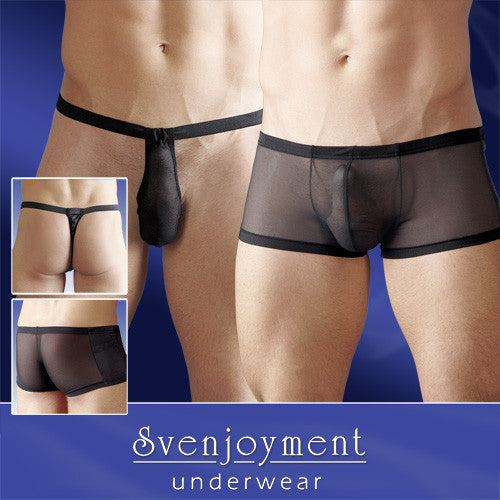 Combination of powernet and satin. The pants' waistband is coated, the rio string has a slender woven-rubber waistband. Black. 90% polyester, 10% elastane.