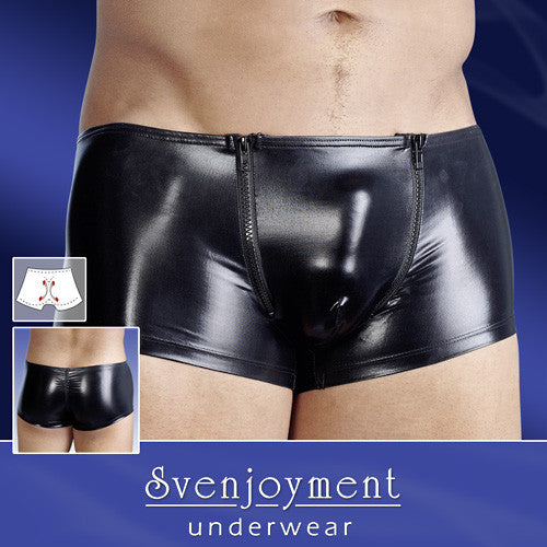 Highly shiny pants with refined buttock-shaping back seam. 2 synthetic zippers in the front on the left and right side of the pouch. Black. 92% polyester, 8% elastane.