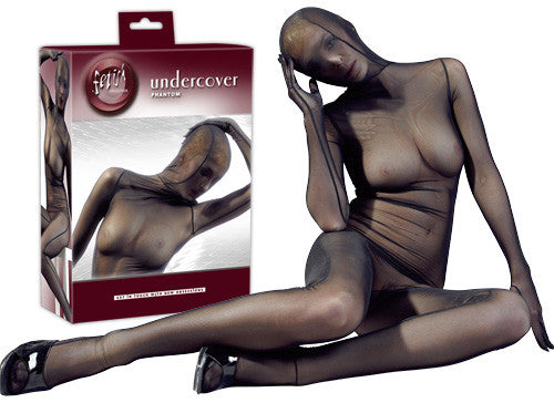 Black jumpsuit made of transparent, elastic power net. All body parts are completely covered even head, hands and feet. Zipper in the back. Material: 90% polyamid, 10% elastane.