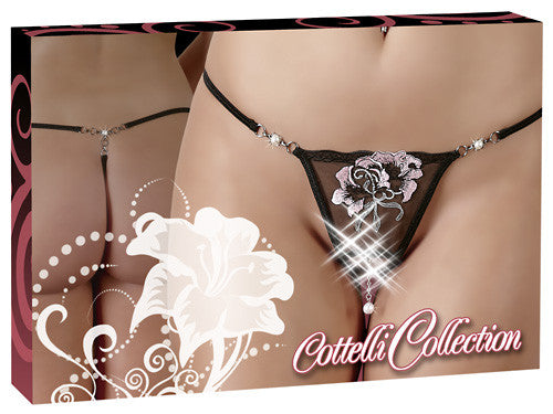 String with embroidery in the front, detachable pearl at the open crotch and a half pearl at the sides and in the back. Black. 100% polyamide.