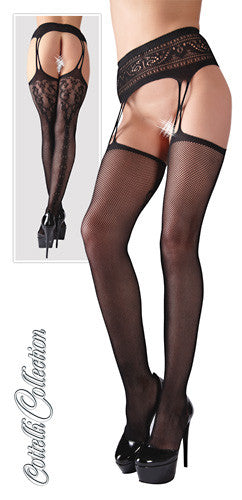 Seamless black lace suspender belt and sewn-on black net stockings with a seam and a lace pattern at the back! Material: 90% polyamide, 10% elastane.