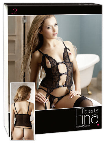 This basque is held together, at the front, by glossy rhinestones on matte satin, while the powernet fabric, at the back, guarantees a perfect fit. The straps and the suspender straps are adjustable. The lace string and the bra cups are very inviting as they are both slitted. 90% polyamide, 10% elastane.