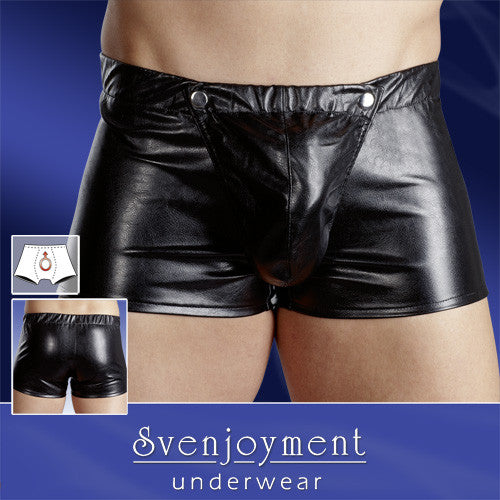 Black synthetic leather pants with swell function for a strong front bulge. Pouch completely detachable. 98% polyester, 2% elastane, with polyurethane-coating.