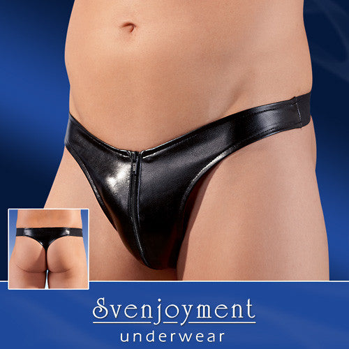 Black high-gloss thong made from soft synthetic leather fabric with a pouch front zipper. 98% polyester, 2% elastane, polyurethane coating.