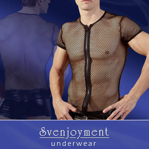 Soft and elastic short sleeve t-shirt made out of coarse black mesh with hems around the edges and a plastic zip that goes right down the front. 100% polyamide.