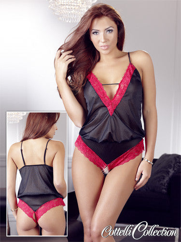 Outfit with a lace trim at the neckline and leg. With an open crotch. Adjustable straps. Black/red. 60% polyester, 30% polyamide, 10% elastane.