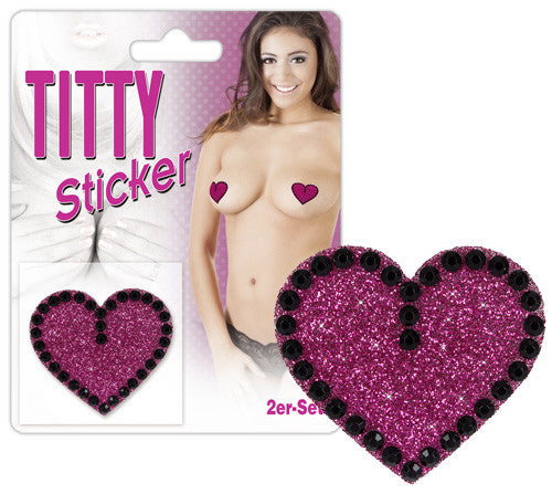 Two glittering pink hearts with black edging made of gemstones to stick on your nipples. Self-adhesive. Approx. 5.2 x 4.9 cm. Material: 80% paper, 15% PET, 5% glue.