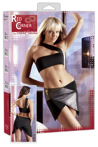 Short black top and mini skirt with silver and gold-coloured inserts in a set. Top with a wide diagonal strap, mini skirt in wrap look and longer on the sides than in the front and the back. 95% polyester, 5% elastane.