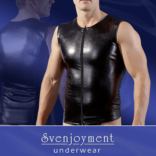 Glossy black tank top made from synthetic leather. Sleeveless with a zip that goes right down the front of the top. Elastic fabric: 98% polyester, 2% elastane, with polyurethane coating.