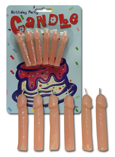 Six flesh-coloured candles shaped like small penises for birthday cakes and other occasions. Each candle 6.5 cm long.