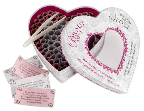 Over 100 romantic and sexy challenges for bride and groom. The heart-shaped box (ø 15 cm) is filled with 100 little papers for romantic seduction (pink-coloured) or a sexy adventure (white). German/Italian Version.