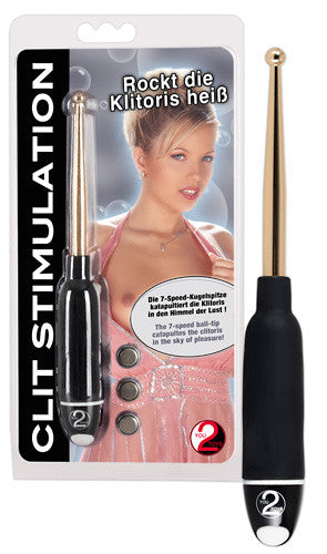 Clitoris stimulator with a stimulation ball at the tip and 7 vibration rhythms at the touch of a button. Complete length 16.5 cm, handle length 9 cm, stick 7.5 cm. Stick-Ø 0.4-0.7 cm. Kugel-Ø 0.7 cm. Black/gold coloured. Material: silicone, ABS, metal, phthalate-free according to EU Regulation REACH. Includes button cell batteries.