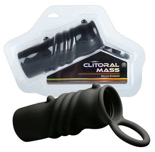 Black penis sleeve with testicle ring and clitoris stimulation knobs. Sleeve has inner grooves and the large outer grooves. 11 cm long, sleeve-Ø 3 cm (slightly flexible), ring-Ø 2.7 cm (flexible width). Material: silicone, phthalate-free according to EU Regulation REACH.