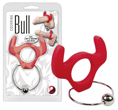 Red silicone cock ring (ø approx. 3.4 cm) with bull horns and metal ring (ø approx. 5.4 cm) through the "nose". Material: metal, silicone, phthalate-free according to EU regulation REACH.