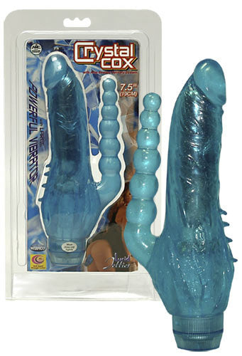 Penis-shaped vibrator made of slippery jelly material, who offers anal and vaginal pleasures. Water-resistant blue/transparent material and silent multi-speed vibrations control.