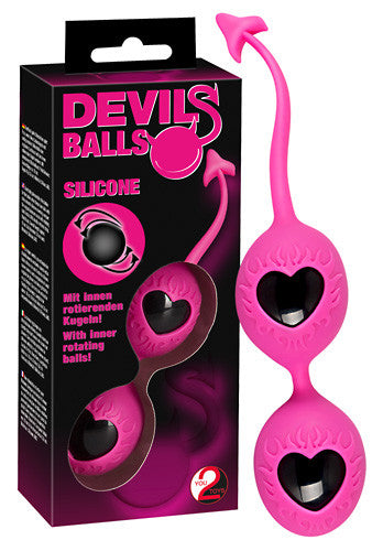 Love ball duo with rotating inner balls and flexible retraction handle. Pink/black. Complete length 18 cm. Ball Ø 3.6 cm. Material: silicone, ABS, phthalate-free according to EU Regulation REACH.