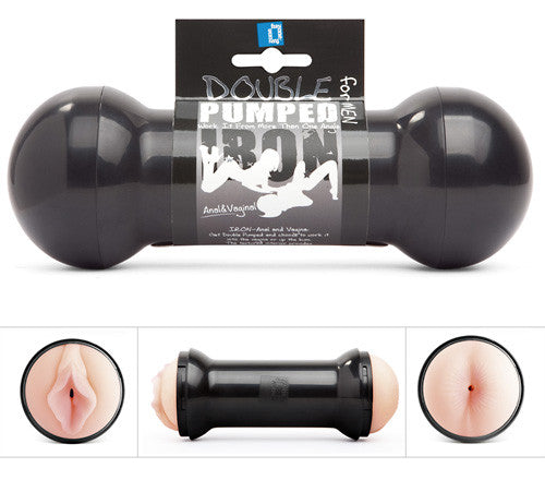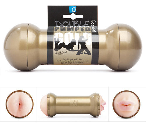 Double-end barbell-shaped masturbator. One oral, one anal entry. Gold/skin-toned. Full size: 21 cm, flexible diameter. Material: silicone, ABS, free of phthalates according to EU regulation REACH.