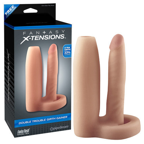 Skin coloured penis sleeve to lengthen and thicken the penis by up to 33%. Open at the top. Attached is a dildo so that both the vagina and anus can be penetrate during sex. With strap. Sleeve approx. 15 cm long, inner-Ø 2.5 cm. Dildo approx. 13 cm long. Material. TPE. Includes lubricant and cleaner.