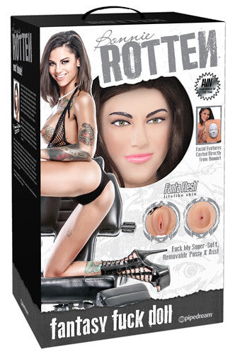 Life-size inflatable doll with a removable lust tunnel and fully formed hands and feet. The breasts are inflatable. With vagina and anus openings. Material: vinyl, PVC, thermoplastic rubber (TPR), hair made of polyester. Includes repair kit, pump, lubricant and toy cleaner.