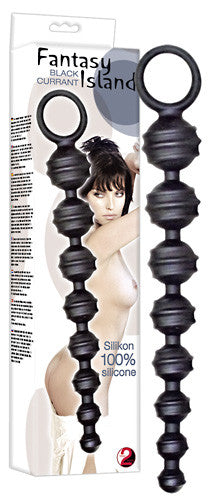 Flexible strand of black ribbed balls with handy ring handle. 32.5 cm long. Ø 2 - 4.5 cm. Material: 100% silicone - extra skin-friendly!