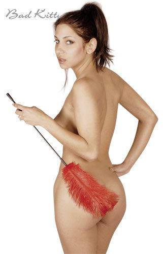Big red feather on a long plastic wand. Size feather: ca. 27 x 13 cm, length wadn: 38 cm.
