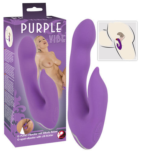 Purple-coloured silicone vibrator with clit-tickler, each with a motor. 7 silent vibration levels, adjustable via silicone-coated LED buttons. Total length vibrator approx. 20 cm, penetration depth 13.5 cm. Ø 2.8 - 3.4 cm. Material: silicone, ABS, phthalate-free according to EU Regulation REACH. (Please order batteries separately: 2 x Micro/AAA).