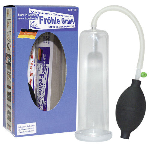 Medico-technical examined brand by "Fröhle" for local under-pressure treatment of the penis. Protected by the patent office! Complete set for specific advanced training of the penis. Brings immediatly more stiffness and strength in the penis. Transparent vacuum cylinder (20 cm long, Ø 5 cm) complete with plug sleeve, hand pump and pressure regulator. Material: PVC/PP.