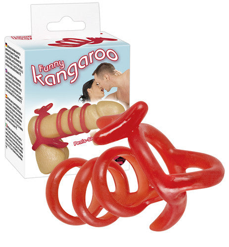 Red penis/testicle harness. 9 cm long, Ø 3 cm to 3.5 cm (malleable). Material: TPE. Free of phthalates according to EU regulation REACH.