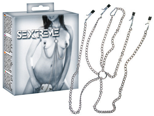 Robust harness made of silvery metal (free of nickel) for her and him. Neck chain, two chains with nipple clamps (total lengths 30 cm each) and two chains with intimate clips (total length 66 cm) are attached to the chest ring (Ø 3.5 cm). Neck chain adjus