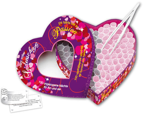 A heart-shaped cardboard box containing 100 little love letters with sexual challenges or suggestions on love positions. It's basically a couples play to explore and indulge each other. Content: 50 white sheets for the man, 50 pink sheets for the lady - so, this is a love play that lasts for almost one year. Bilingual edition: German/Swedish.