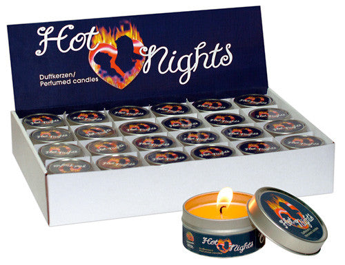 Display box with 48 fragranced candles. 6 different scents: Orange, vanilla, lavender, cinnamon, peach and rose.