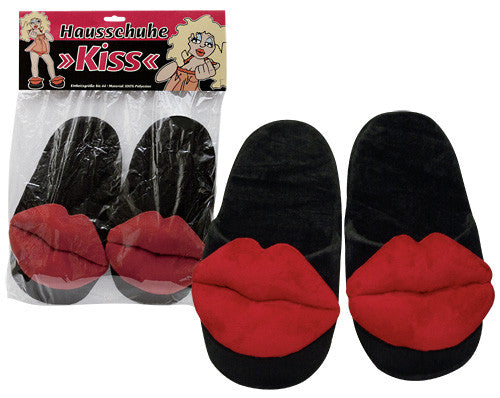 Black plush house slippers with red kissing-lips, comfortable to slip in. One size up to 42. 100% polyester.