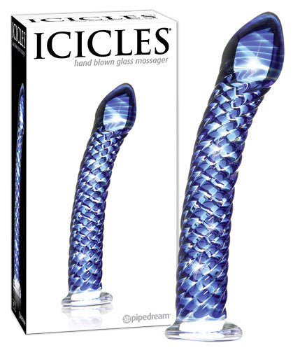 Hand blown blue dildo made of unbreakable high-quality glass with stimulating structure and smooth tip. On a suction cup. Odourless, anti-allergenic and very hygienic. Total length 20.5 cm, penetration depth 19.5 cm, ø 2.6 - 3.4 cm.