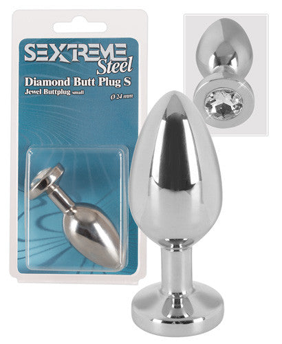 Silver coloured anal plug with a rhinestone diamond. 5.6 cm long, plug-Ø 2.4 cm. Material: steel, acrylic glass (rhinestone).
